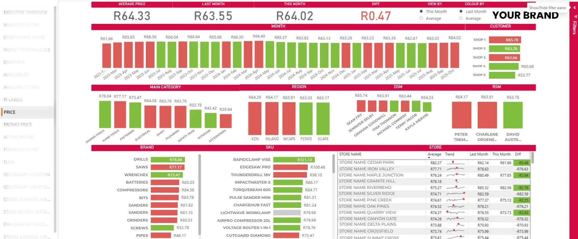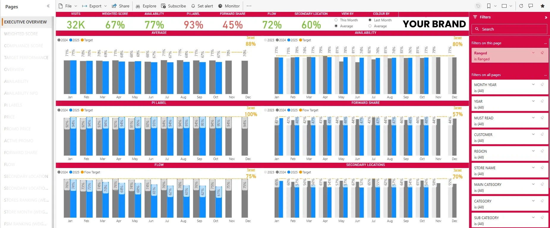 Start with a complete snapshot of your business performance. The Performance Overview brings all key KPIs together – availability, pricing, visibility, promotions and forward share – and shows how each one tracks against historical and target values. Weighted metrics ensure you see what truly drives growth, giving your team a balanced view of performance by brand, category or region.
